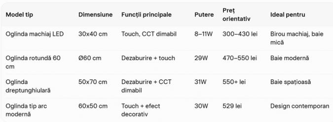 - Funcții esențiale – prioritează dezaburire și CCT dimabil dacă folosești oglinda după duș sau pentru machiaj.